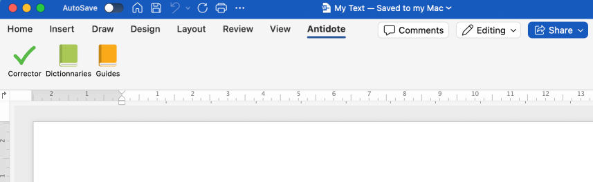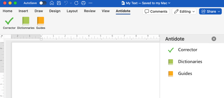You can easily access the corrector, dictionaries and language guides under the Antidote tab in the ribbon.
