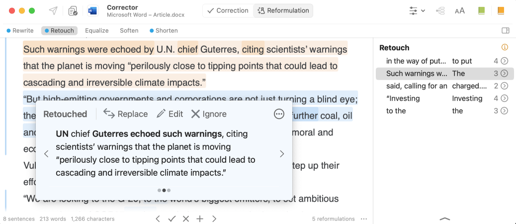 Once you’ve finished your first draft, polish it with the Reformulation mode. It’s handier than you might think, if you know how to use it effectively. The Retouch view is particularly useful for fixing stylistic issues, like impersonal constructions or passive voice.