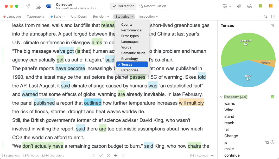 Although not a strict rule, using the present tense makes an article more dynamic. Quickly view all the verbs in a text, listed by tense, using the Tenses filter. This way, you can check whether it’s really necessary to use the past tense. For example, in the passage “a report that outlined how further temperature increases will multiply the risk of floods”, the present “outlines” could suffice.