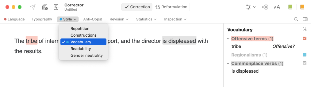 The Vocabulary filter highlights opportunities to refine word choices in your text. Among other things, it flags redundancies, informal or old-fashioned language that could deviate from the tone you’re aiming for, and inappropriate or offensive terms (sexist, homophobic, racist, etc.).