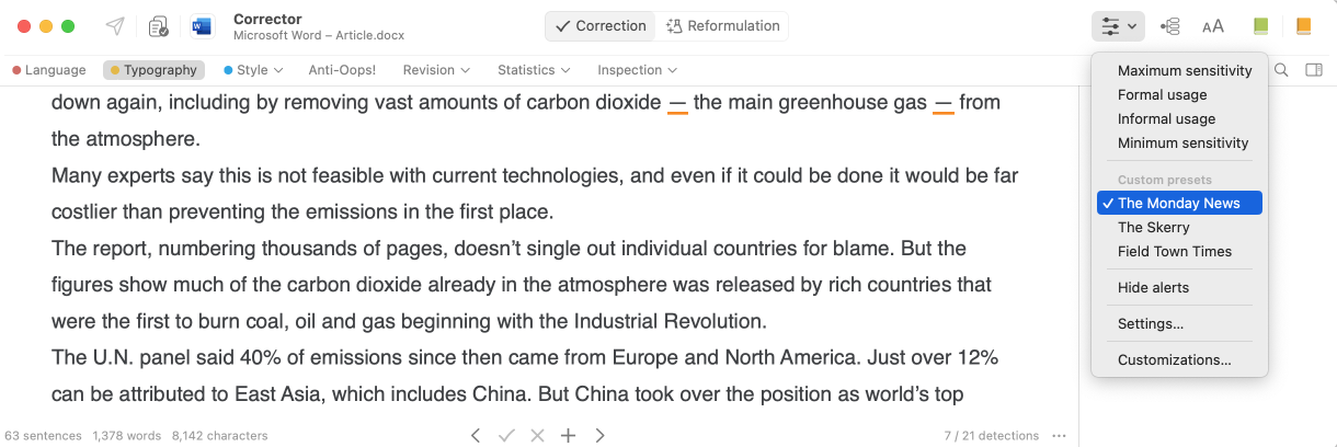 Each publication has its own typographical preferences. For example, some might use the em dash to separate parenthetical phrases, while others opt for the en dash. You can save several presets and choose among them directly from the corrector. This feature is great for journalists who write for multiple publications, ensuring a text will always meet a given outlet’s in-house standards.