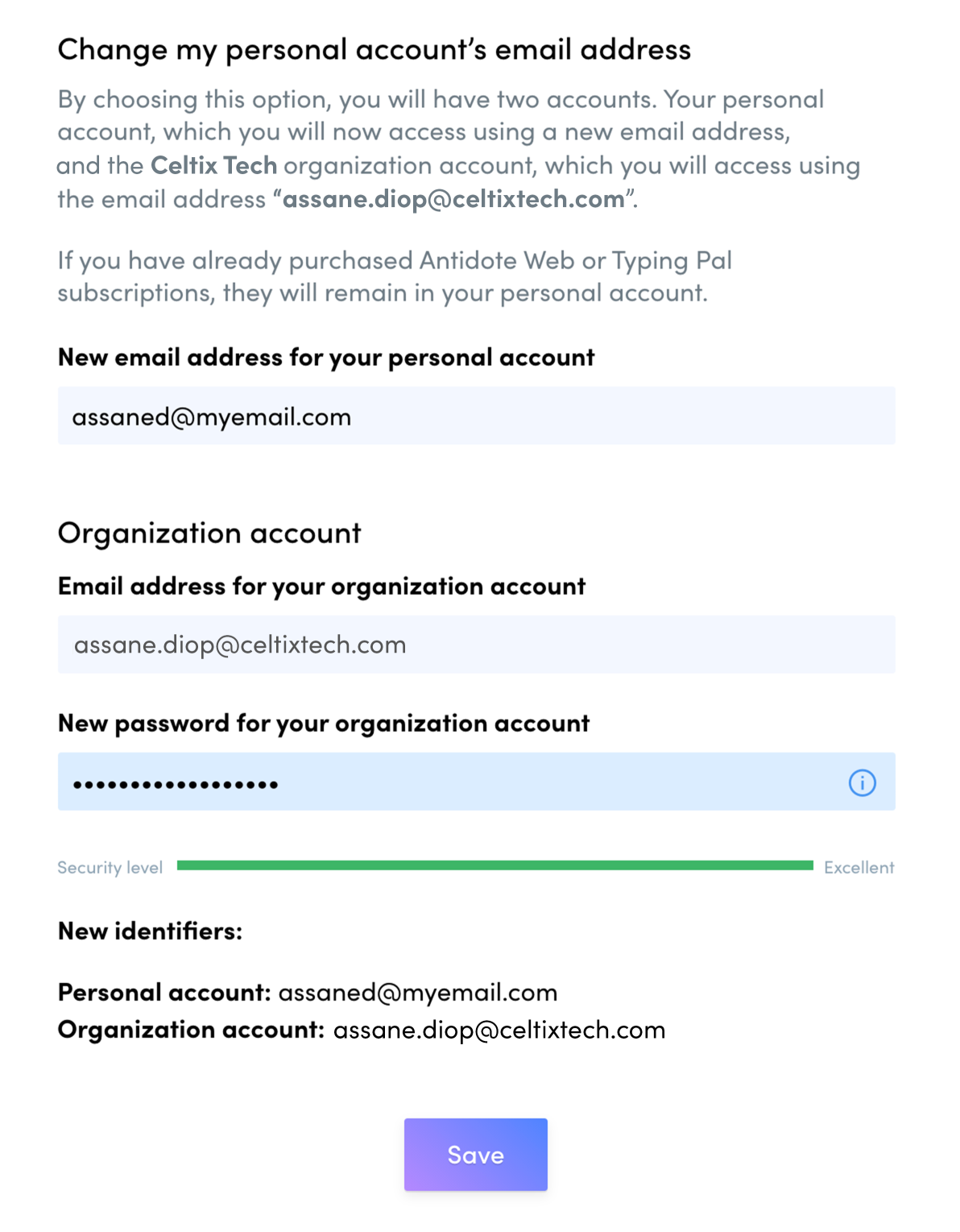 Example — Assane uses the professional email address assane.diop@celtixtech.com for his personal Druide account. However, his employer has registered the domain name celtixtech.com in order to create organization accounts for an Antidote Web subscription. When Assane accepts the invitation from Celtix Tech, he will need to enter a private email address for his personal account such as assaned@myemail.com.