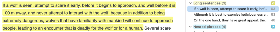 Long words can be detrimental to a text’s readability, especially if they are not frequently used and contain a large number of letters and syllables. Try not to use too many of them, particularly in texts written to be read aloud, or your reader might stumble! If needed, replace a long word with a shorter synonym using the Synonyms command in the tooltip, or by double-clicking the word in the correction panel.