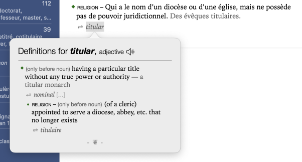 For example, in the French adjective entry titulaire, each of the four definitions has its own translation. In the context of religion (fourth definition), the English translation is titular. Clicking this translation once will cause a tooltip to appear showing the religion-specific English definitions of titular. This allows users to compare the French definitions with the English ones. Double-clicking the translation will open the English entry for the word in question.