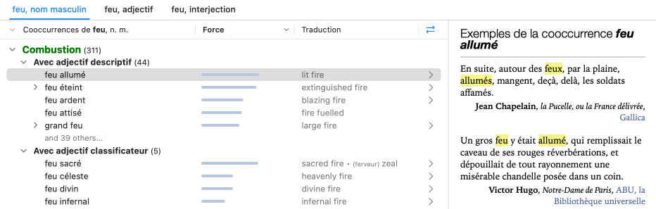 The dictionary of combinations (called cooccurrences in French) displays all the most significant combinations of the headword with other words. These are grouped by syntactic context, in addition to the strength of each combination and, if applicable, the various meanings of the headword.