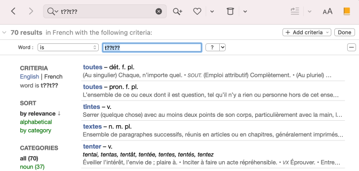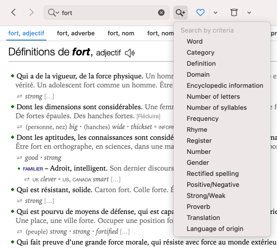 Search by criteria is a powerful tool that lets you make the most of the vast stores of information in Antidote’s French dictionaries. The same tools are offered for searching by criteria in French as in English, and they are accessed in the same way for both languages. For the most part, the search criteria are also the same in both languages; you can search by word, category, definition, domain, encyclopedic information, number of letters, number of syllables, frequency, rhyme, register, grammatical number, positive/negative, strong/weak, proverb, translation, language of origin and compound word. The criteria gender and rectified spelling are added in French.