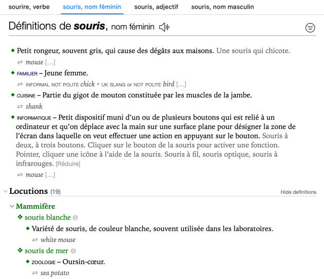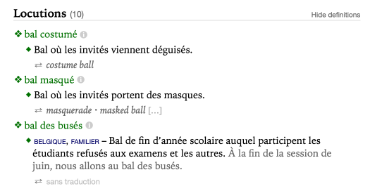 Every definition of every word and expression is accompanied by a translation, both from French to English and from English to French. These translations can be hidden by clicking the Hide translations toggle in the menu under the configuration button (). When displayed, translations appear in italic grey text under each definition and are preceded by a ⇄ symbol.