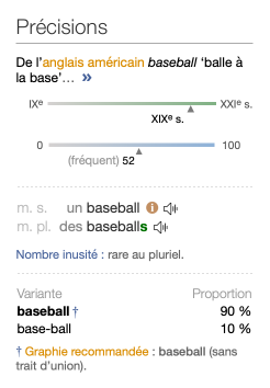 If the headword is subject to the 1990 French spelling rectifications, Antidote displays a note with the rectified spelling (e.g. flute, rectified spelling of flûte). In the case of a word with alternative spellings, one of which is recommended by the rectifications, a blue dagger symbol (†) highlights the recommended spelling (e.g. baseball, recommended without a hyphen).