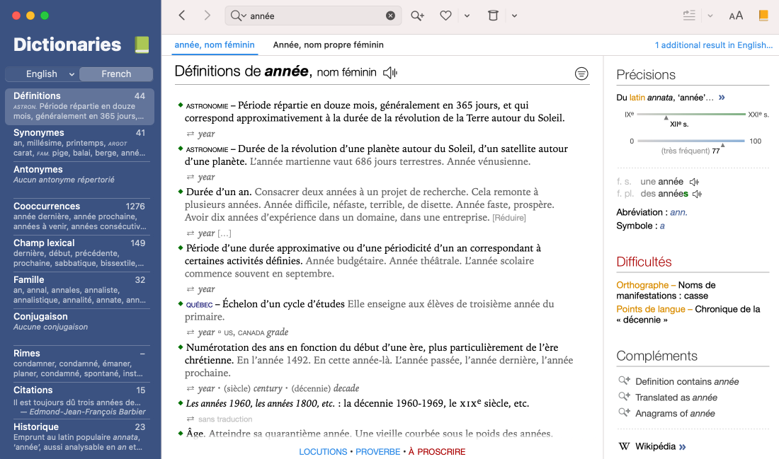 Antidote’s French dictionaries contain a wealth of information on all aspects of the French language: the meaning of words and idioms, pronunciation, spelling variants, synonyms, conjugations, semantic fields, combinations, etymologies and more.
