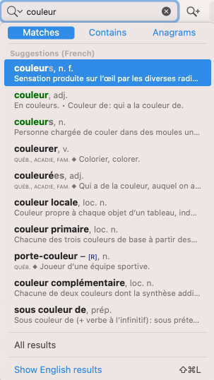 The instant search menu appears as soon as you start typing in the headword search field and displays a list of the most relevant search results. For many expressions, Antidote’s dictionaries also contain results in the other language; to see them, just click Show French results (when searching the English dictionaries) or Show English results (when searching the French dictionaries) at the bottom of the menu.
