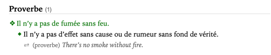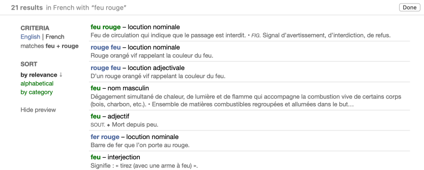 Like its English counterpart, French multi-word search allows you to search for complex expressions in the dictionaries. This feature makes it easy to find links between words, like those that occur in expressions, combinations, proverbs, etc.