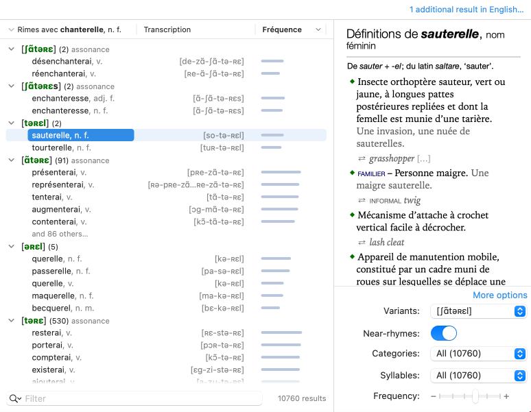Like its English counterpart, the French dictionary of rhymes presents words and expressions that rhyme with the headword. Results are presented the same way: according to the number of identical phonemes. Both languages offer a similar set of display options, although there are some key differences.