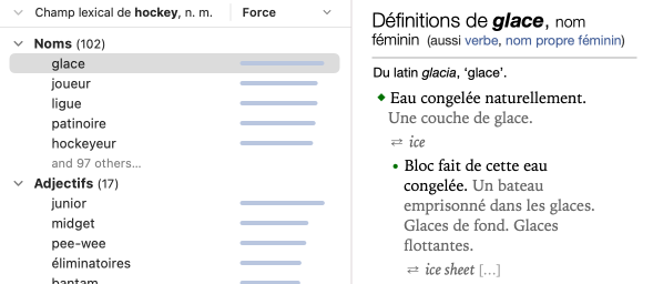 The French dictionary of semantic fields displays all the French words that are semantically related to the headword. These are grouped by syntactic category (nouns, adjectives, verbs) and ranked by relative strength.