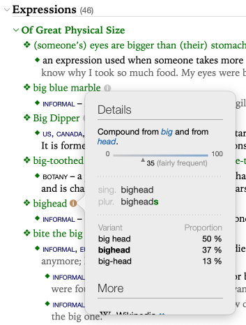 After reading a word’s definition, you may want to find out even more about it or to consult an encyclopedia. A link to the Wikipedia online encyclopedia is displayed in the More section of the right-hand panel for a noun or proper noun, and in the More section of the additional information bubble for many expressions (click the icon beside the expression to display it). Note that you must tick the Wikipedia checkbox in the External Resources Panel of the Interface Settings for this option to apply.