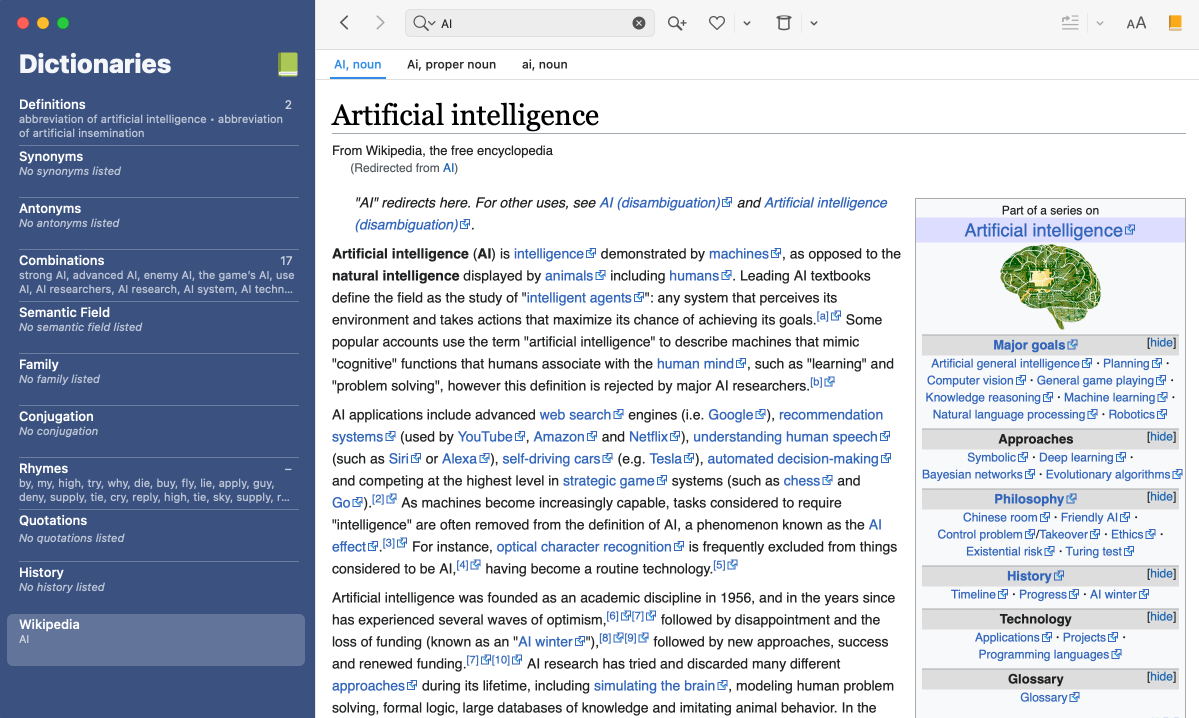 Your Wikipedia access history is recorded in the same way as your search history is in Antidote’s dictionaries, so you can easily go back to an article you consulted earlier. It may take a bit longer to load a Wikipedia article than an entry in the dictionaries given that Antidote communicates with Wikipedia over the Internet. A Wikipedia section will appear at the bottom of the list of dictionaries in the sidebar and will remain displayed there so long as the headword doesn’t change. You can consult the definition or synonyms in Antidote, for instance, then return to the Wikipedia article by clicking Wikipedia in the list.