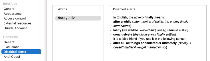 - The right-hand column may display multiple alerts for the same word. When a word is subject to multiple alerts, none of them will be flagged by the corrector if the word appears in the Disabled alerts list.