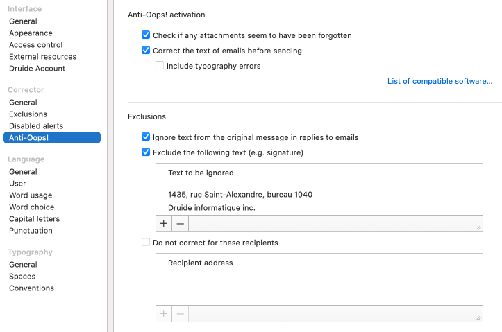 Click the List of compatible software link in the Anti-Oops! panel of the settings to go to our website and see a list of email clients compatible with our Anti-Oops! technology.