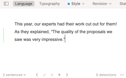 Dialogues and quotes often possess particular attributes that you may wish to leave intact. You can instruct the corrector not to flag certain errors in these passages. If necessary, specify whether these errors are to be ignored in the Language or Style views.
