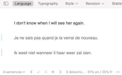 Antidote can help you quickly spot and bypass passages of text written in a language other than English by displaying a vertical blue bar in the left-hand margin of the correction panel anywhere text written in French occurs and a grey bar where text written in some other language occurs. Antidote displays the percentage of the text that is written in English and the percentage in French in the status bar below the correction panel.