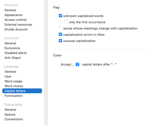 Depending on the conventions followed, independent clauses that come after a colon (“:”) can start with either a capital or a lowercase letter. This setting lets you instruct the corrector to require either lowercase or capital letters after a colon or to accept both cases.