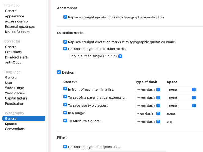 - By default, this setting is configured to follow typographic norms. To disable corrections linked to dashes without modifying the individual rules, uncheck the general checkbox in this zone.