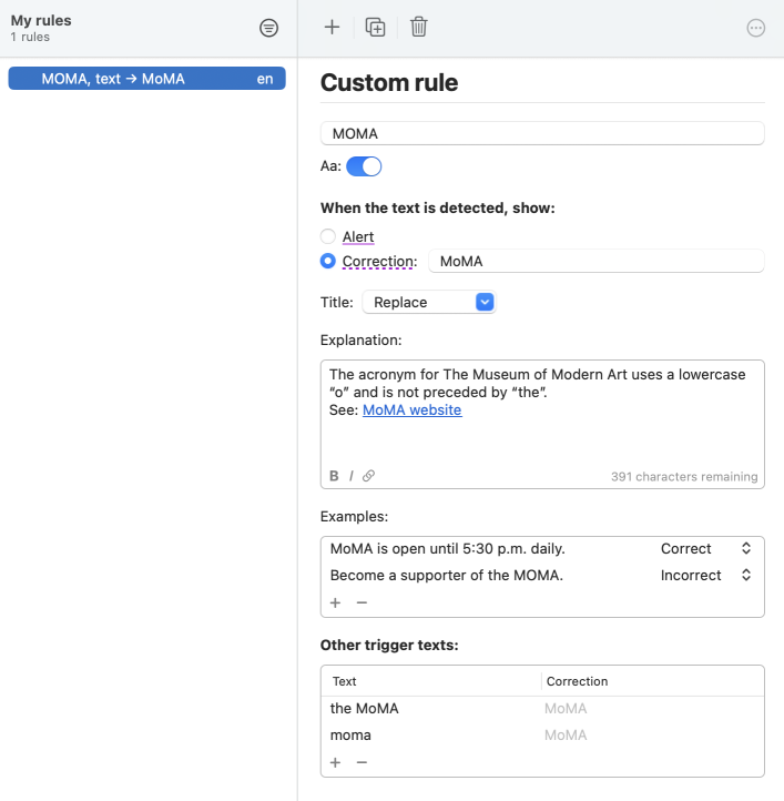 A rule can trigger an alert (thin underlining) or a correction (thick underlining). An alert is like a warning: it aims to draw your attention to the trigger text or word without necessarily replacing it with something else. A correction means that the trigger word or text should be replaced; correction rules must include a replacement word or text.