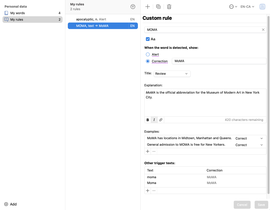 A rule consists of a trigger, a detection type, an optional replacement word and an explanation. It generates a detection, which can be defined as either an alert or a correction. You can also illustrate the rule by adding examples of correct and incorrect use. You can even supplement the rule with other similar triggers that can produce different corrections.