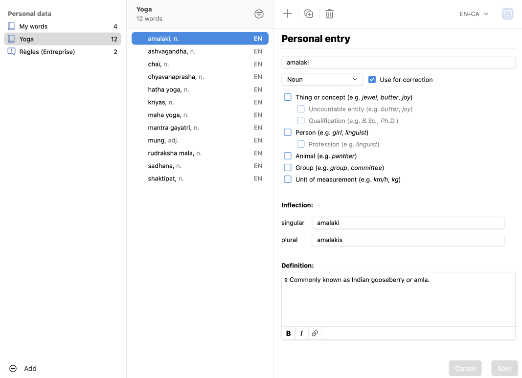 Customizations are pieces of information that you add to Antidote; they are your personal contribution to Antidote’s dictionaries and its correction process. The customization tools have been developed to allow your additions to integrate perfectly with Antidote’s existing content while preserving their distinctive character, particularly through the use of colour. Your new word’s definition will be displayed in the dictionaries like any other, and the rules you create will prompt their own tooltips, just like Antidote’s built-in corrections. Customizations help Antidote get to know you and serve you better.