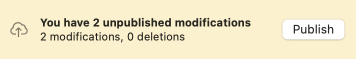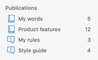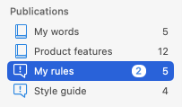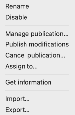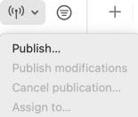 Rename: You can rename a publication at any time. The new name is an important modification, and Antidote indicates this modification with a bullet point to the right of the publication, as well as a reminder at the bottom of the central list. To distribute this change to your subscribers, select the Publish modifications option from the menu or click on the Publish button in the reminder.
