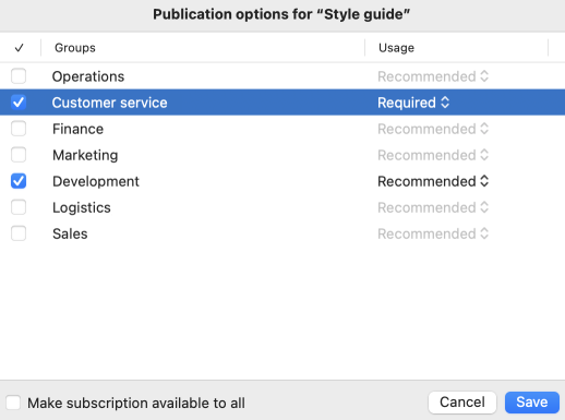 - Make subscription available to all: All users in the organization can subscribe to your customizations and can choose whether to activate them.