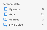 Unshared customizations are located in the Personal data section in the window’s left-hand panel. Select the dictionary or list of rules to share from here, click the () button that displays when you hover your mouse, then select the Publish option from the menu.