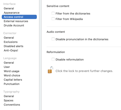 The corrector’s Reformulation mode uses artificial intelligence to offer suggestions for rewording your writing. This involves sending your text to Druide’s servers. Although Druide does not keep any data submitted to Antidote for reformulation (see Reformulation and Data Privacy), you may occasionally want to disable this feature—in certain educational contexts, for example. When this setting is enabled, all interface elements relating to reformulation disappear.