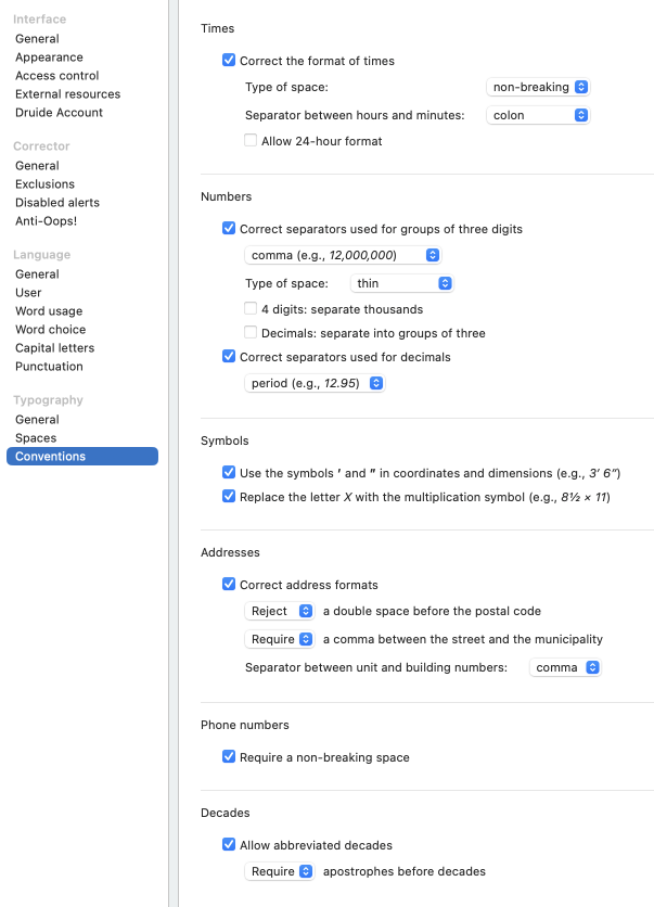 When this box is checked, Antidote will correct certain errors in address formats. You can tell it to Accept, Require or Reject double spaces before the postal code and to Accept, Require or Reject a comma between the street and the municipality. If so instructed, the corrector will also verify the character used to separate the unit and building numbers; choose from an en dash, a comma or any separator.