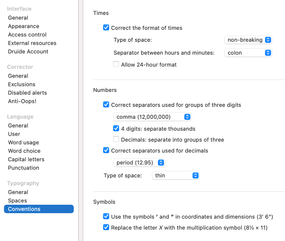 When this box is checked, Antidote will correct time formats using the spacing (no space, breaking space, non-breaking space or any type of spacing) and the character type (colon or period) you prefer for separating hours and minutes. You can also instruct Antidote to accept times written in the 24-hour format.