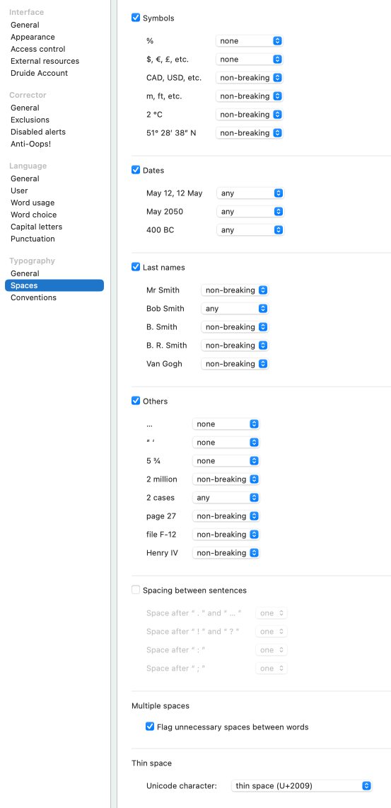 - The corrector applies the typographic conventions of your chosen national language variety to the spacing of your text by default. To disable alerts related to spacing around the elements described below, uncheck the box beside the title of each section (top left) as you see fit.