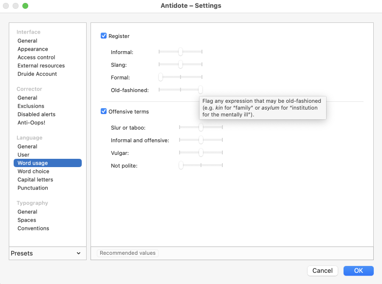 Antidote’s settings are divided into four main sections: Interface, Corrector, Language and Typography. By default, the settings in each panel are adjusted to the value recommended by Druide. The Typography section, for example, contains settings that follow the norms common to your language variety. These can be changed at any time, either individually or en masse by applying the default presets or one you created yourself.
