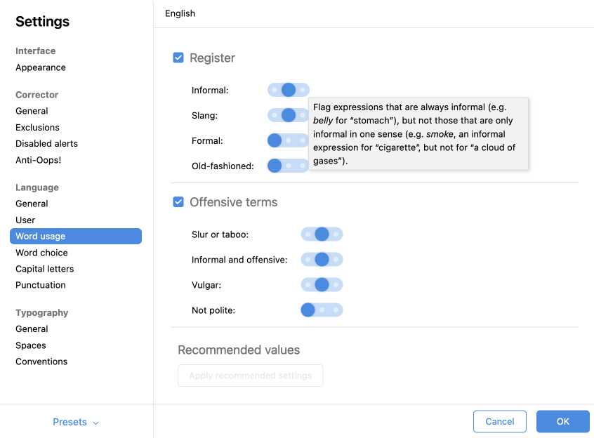 Antidote’s settings are divided into four main sections: Interface, Corrector, Language and Typography. By default, the settings in each panel are adjusted to the value recommended by Druide. The Typography section, for example, contains settings that follow the norms common to your language variety. These can be changed at any time, either individually or en masse by applying the default presets or one you created yourself.