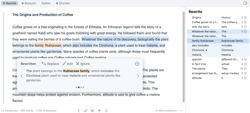 - Click a row to highlight the corresponding segment of the source passage (unchanged) in the text and, in the tooltip, the proposed change resulting from the reformulation.