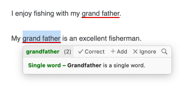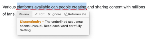 In the Language view, when the corrector encounters an unusual sequence, it will still display detections, but it will be less sure of its diagnosis in these cases. The tooltips for such detections are labelled Review to warn you of the corrector’s uncertainty.