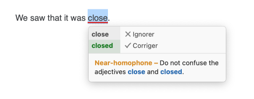 Each detection in the corrector includes an explanation, allowing you to understand and evaluate Antidote’s intervention. Sometimes, it may be necessary to evaluate multiple aspects of the same word. In this case, Antidote will provide all the necessary contextual explanations.
