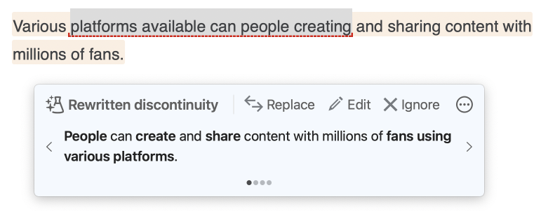 The Reformulate command serves as an invaluable ally when the correction doesn’t offer an immediate solution. The correction uses the creativity of reformulation to offer up to four alternatives to help you find a solution. Antidote offers reformulation for the following detections: