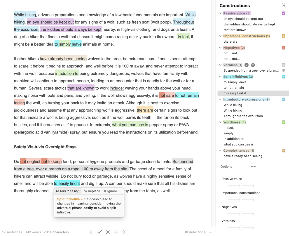 If you would like, Antidote proposes reformulations for passive, impersonal, negative and wordy constructions. To see the suggested reformulations for these detections, click the Reformulate command in the corresponding tooltip.
