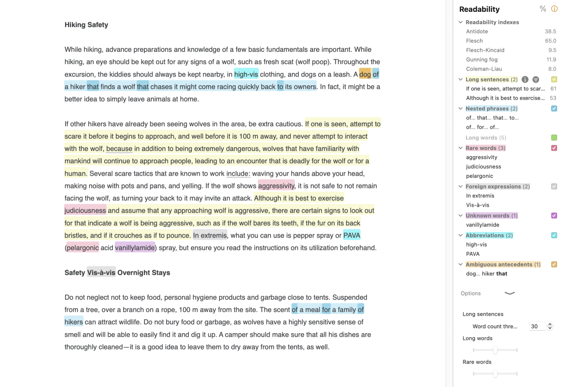 Long words can be detrimental to a text’s readability, especially if they are not frequently used and contain a large number of letters and syllables. Try not to use too many of them, particularly in texts written to be read aloud, or your reader might stumble! If needed, replace a long word with a shorter synonym using the Synonyms command in the tooltip, or by double-clicking the word in the correction panel.