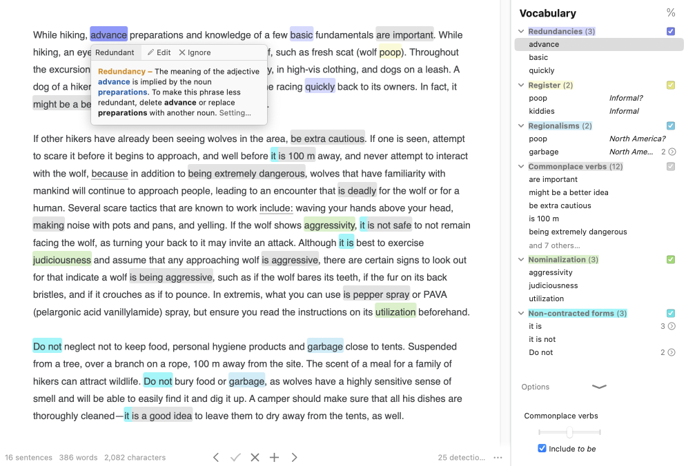 The verb expresses the action of a sentence, serving to link the subject and the object. Therefore, the verb has an important role to play: it has to make a good impression on the reader. Antidote will locate “dull” or “empty” verbs in your text and those that are overused, so you can replace them with “full” verbs that carry a distinct and precise meaning. So instead of writing She is doing an experiment in nuclear medicine, you might prefer She is conducting an experiment in nuclear medicine.