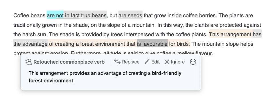The reformulation tooltip has its own unique design with everything you need to reformulate the entire sentence or a portion of it. See the Handling a Reformulation page to learn more about its various components.