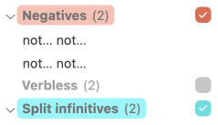 The Style view presents its detections with highlighting and tooltips, and groups them by type in the list of results. This section describes the handling of detections by this dynamic component.