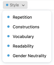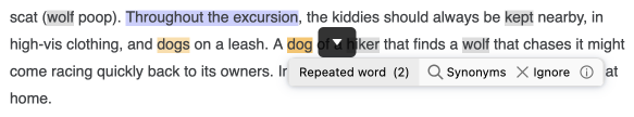 The tooltip of a style detection displays suggestions and actions tailored to the type of detection for even more convenience. On some types of detection where an explanation is unnecessary (repetition, for example), the tooltip may be limited to a single line.