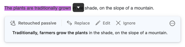 Some of the style filters make use of Reformulation mode, which gives you creative solutions to restructure elements like passive voice or long sentences. Choose the reformulation that you want to use, and insert it into your text in one click.