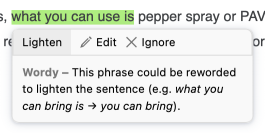 Sometimes lightening the text requires deleting a word or two. To approve the corrector’s suggestion, click the Delete command in the tooltip. The highlighted segment disappears from your text, with the corrector adjusting the capitalization as needed; the detection then disappears from the list.