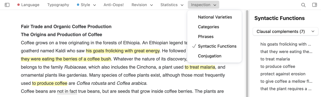 The one hundred or so filters of the Inspection view dissect the basic elements of your text, allowing you to examine it in depth.